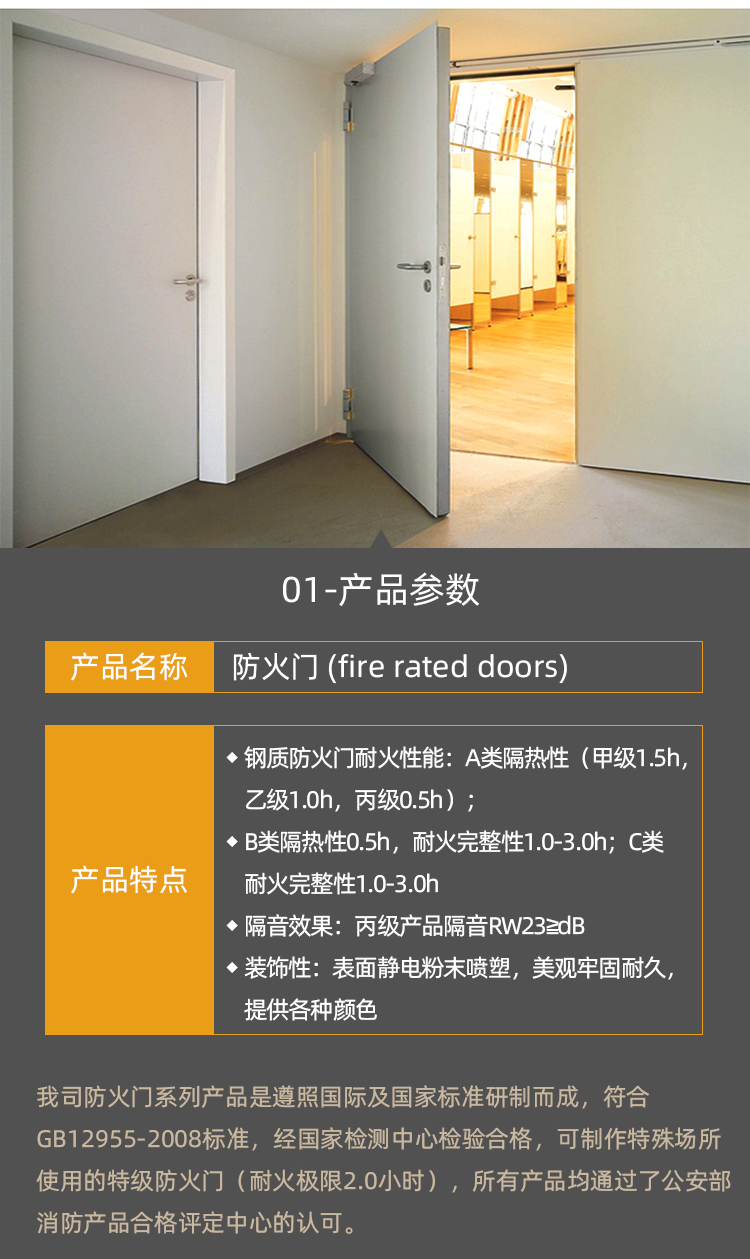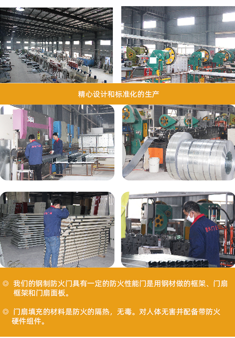 钢质防火门为用钢质材料制作门框、门扇骨架和门扇面板,门扇内若填充材料,则填充对人体无毒无害的防火隔热材料,并配以防火五金配件所组成的具有一定耐火性能的门。